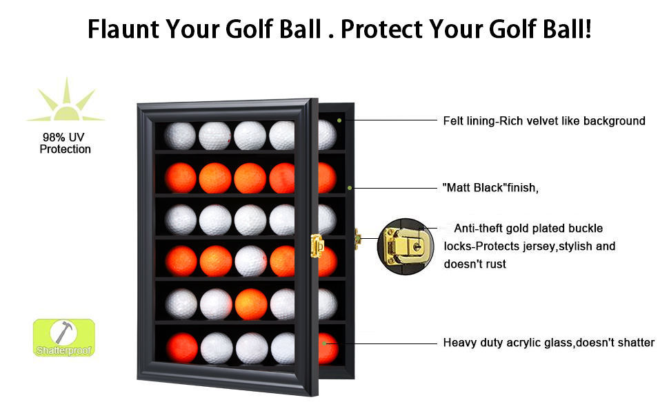 DescriptionDisplay your golf ball collection in style with this sleek black display case.Featuring a lockable clear door and durable wooden frame, this cabinet keeps your collection safe, organised, and dust-free. Perfect for collectors, golf lovers, or as a unique gift.